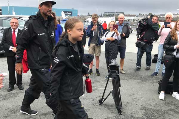 Greta Thunberg and her skipper Boris Herrmann in Plymouth, England, shortly before sailing to the Americas on August 14, 2019 (Alexandra Ma/Business Insider)