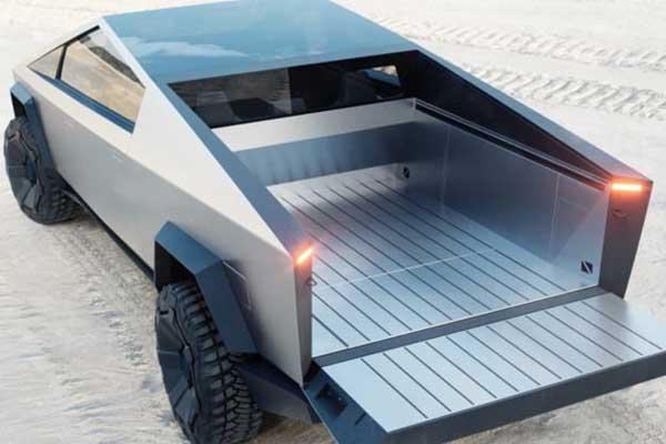 The Tesla Cybertruck with the bed open and ready to load, from a promotional shot on the company’s web site.